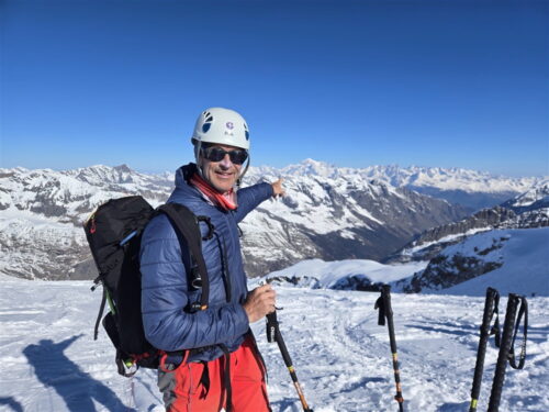 La vue à 360 degrés est magnifique du Cervin et du Mont Rose au Nord Est jusqu’à la barre et le dôme des Ecrins et le Viso au Sud Ouest en passant par le Mont Blanc au Nord Ouest.