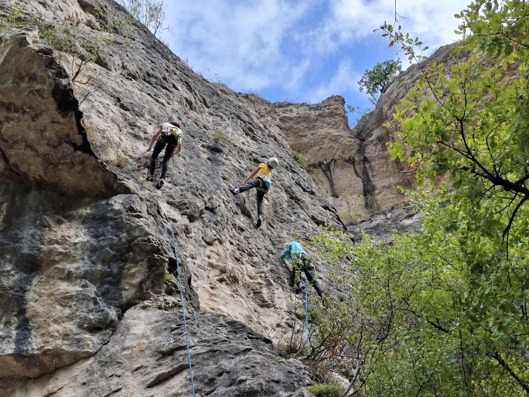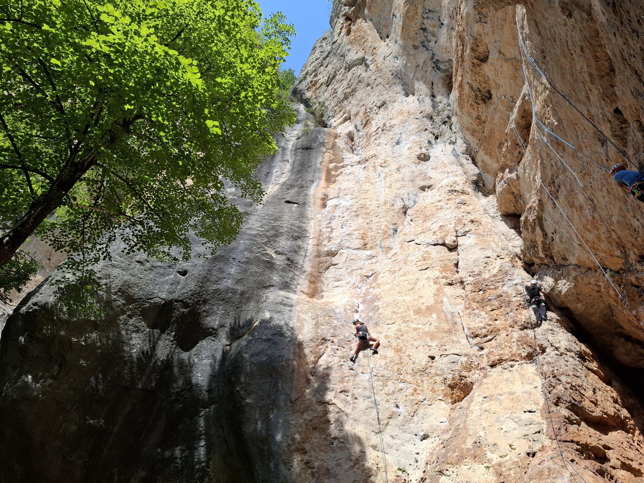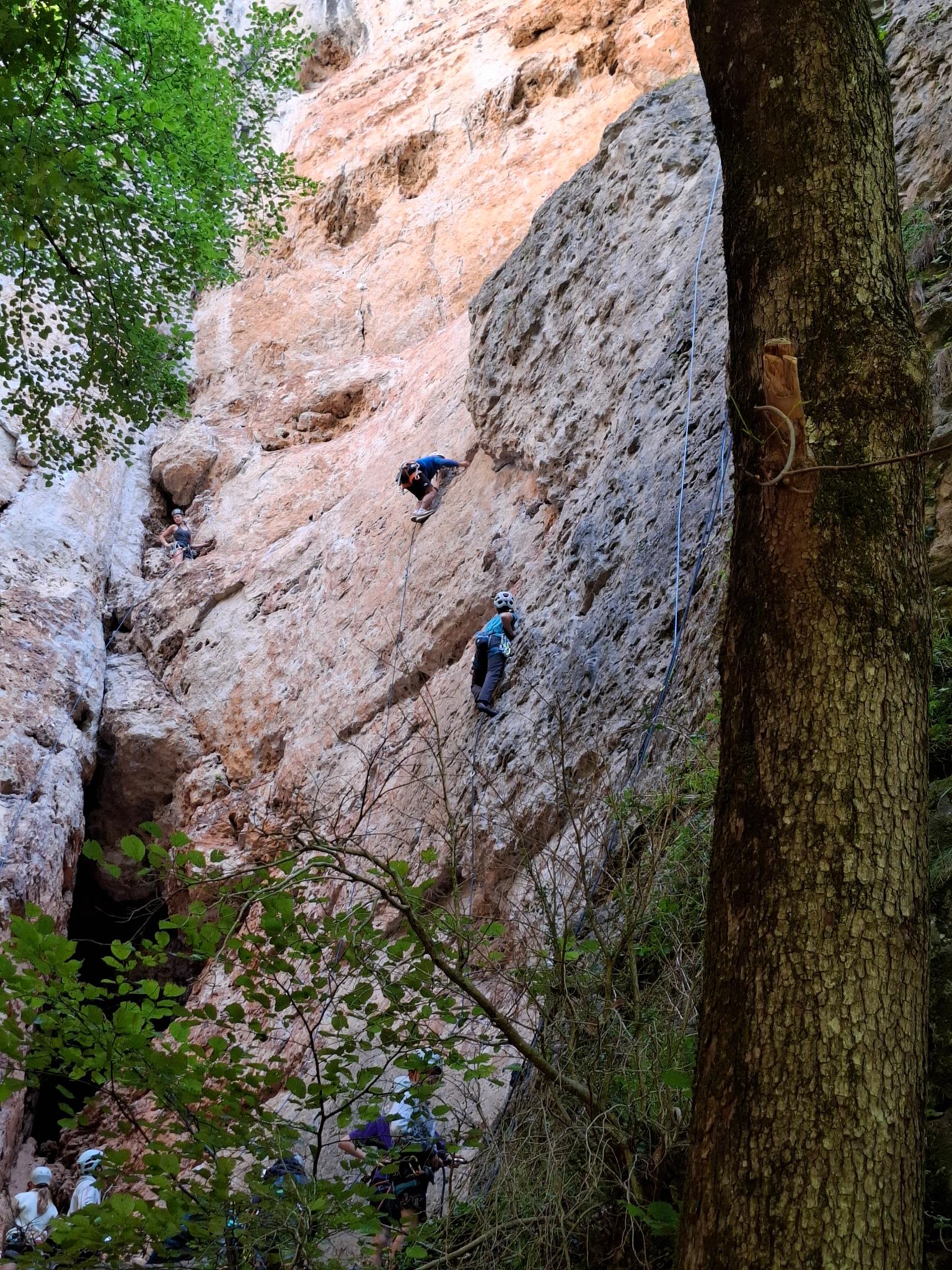 Après un montage des tentes rapidement effectué, nous nous en allons toucher les premières voies sur un petit secteur initiation, histoire de se rappeler le bon goût du rocher et de réviser les manips.