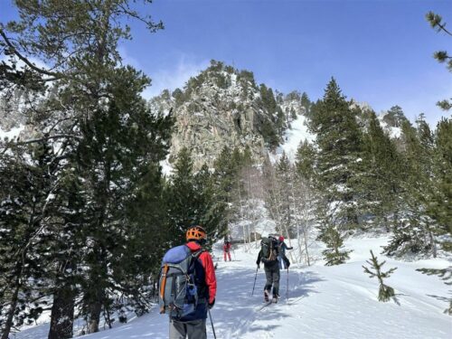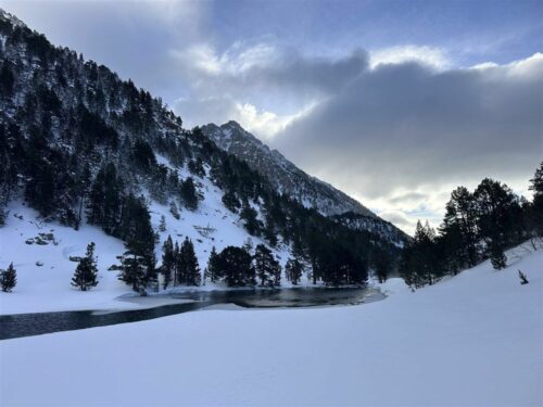 Les 3 françaises sont parties juste avant nous et après avoir admiré les fameux 2 Encantats nous chaussons les ski en espérant profiter de la vue dégagée pour savourer une belle 1ère descente dans la poudreuse. Hélas, toute l’équipe s’est vue clouée sur place avec d’énormes plaques de glace sous les spatules. Il nous a fallu pas moins de 1/2h pour gratter et faire descendre la température de nos semelles afin de retrouver de vraies sensations de glisse. Le paysage était magnifique et accompagné de quelques rayons de soleil nous nous laissons glisser jusqu’au lac où une tempête de vent décoiffait déjà des randonneurs en raquettes. Protégés par un abris pour touristes, nous faisons une courte pause avant d’entamer le tour du lac par l’extérieur: un vrai gymkhana qui très vite s’est terminé par une traversée contre le vent mais au milieu du lac partiellement gelé. A l’autre bout, il nous a fallu nous frayer un chemin dans les sapins pour rejoindre le sentier qui devait nous mener vers le portarro d’Espot via le joli vallon du riu del Portarro. Petit passage avec les couteaux mais avant que le ciel ne se dégrade nous faisons une halte pique-nique à 20 mètres du col mais à l’abri du vent.