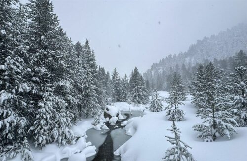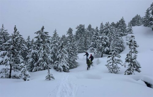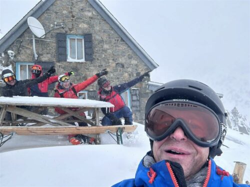 Idem le lendemain matin avec un coup de fil inter-refuge pour finalement décider ensemble de lâcher l’affaire car le risque d’avalanche allait passer à 4. Du coup, d’un commun accord, nous décidâmes de rentrer sur Colomers et de raccourcir ce raid bien engagé. C’était sans compter à nouveau avec des conditions difficiles dans la neige et le vent. Heureusement, Christophe était en tête avec sa montre connectée et les traces de notre parcours qui lui indiquait la direction à tenir. Pas facile mais petit à petit nous avons rejoint le port de Caldes et avons basculé côté colomers. A gauche ! non à droite ! l’intelligence collective bat son plein et acculés au pied d’une corniche nous réussissons à trouver un passage salvateur qui ouvre le chemin vers Colomers où nous soufflons au chaud pendant une heure avant de reprendre le chemin du parking. Petite astuce du gardien : plutôt que de descendre sous le barrage comme à l’aller nous chaussons les peaux et remontons sur un petit plateau pour basculer dans un goulet bien enneigé et rejoindre plus facilement nos traces de l’aller. Une belle glissade, toujours plus ou moins dans le blanc mais entre les beaux sapins eneigés et jusqu’au parking : top !