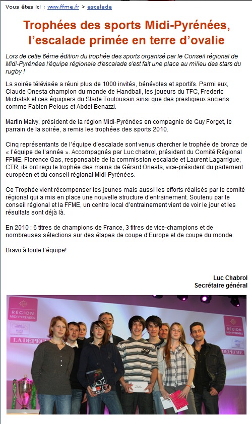 Année 2010 – L’équipe régionale d’escalade médaille de bronze aux trophées des sports Midi-Pyrénées (tous sports confondus).