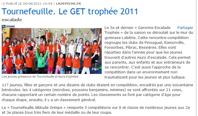 17/06/2010 – La dépêche – Tournefeuille, 140 jeunes grimpeurs au Garonne Trophée Escalade (GET)